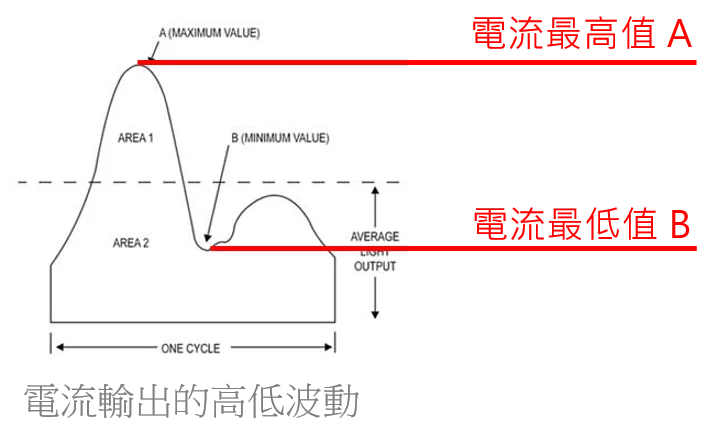 閃爍百分比愈小,代表光源亮暗閃爍的程度愈小。當A=B時,代表電流穩定不變,閃爍百分比為0%