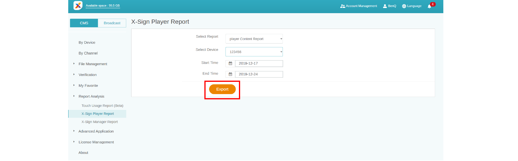 1. To access the player content report, click Report Analysis > X-Sign Player Report > player Content Report.